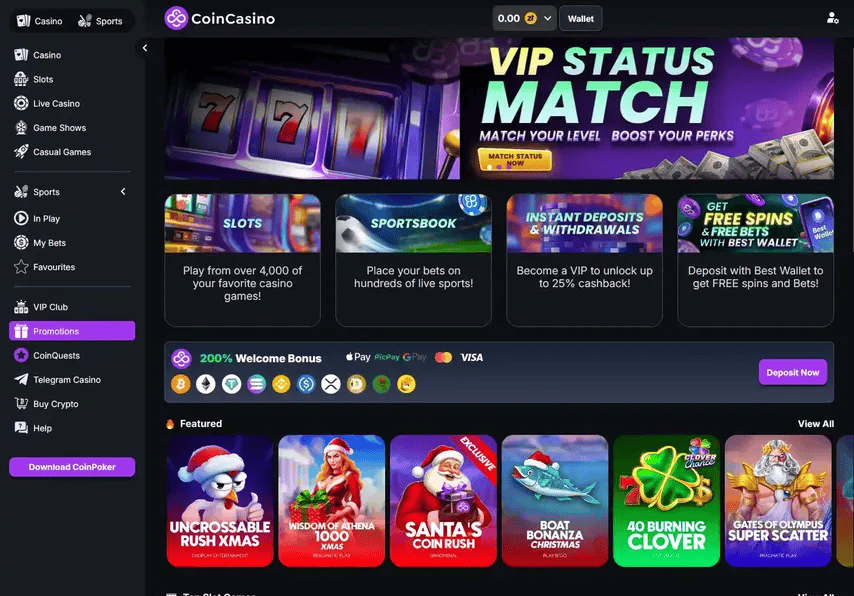 CoinCasino is the newest platform on this list and has climbed to the top of several rankings largely on the strength of its welcome offer and its no-KYC architecture. It operates as a pure crypto-first site. With no fiat, no bank transfers, no unnecessary friction. Registration requires only an email address, and players can be playing within minutes of their first wallet deposit.