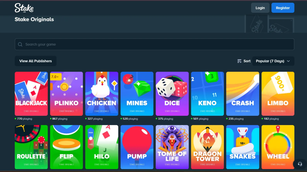 Stake Originals in-house games, including Crash, Plinko, Mines, Dice, Limbo, and HiLo, are provably fair and independently verifiable on-chain. Third-party slots and live dealer games from Evolution Gaming round out one of the most complete game libraries available.